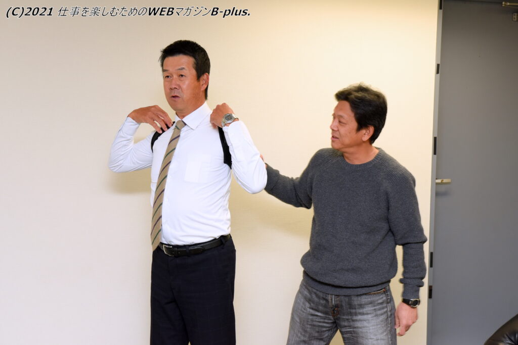 八木さんも昔からストレートネックで猫背を気にしているとおっしゃってたので、猫背矯正ベルトを付けてもらったら大変気にいってもらえました。