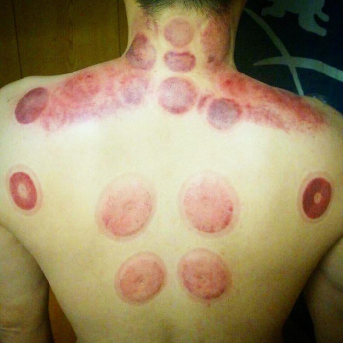 カッピングを行うと、カップの跡が残ります。この跡のことを溢血班(いっけつはん)と呼び、その色などから体の状態を知ることができます。例えばカップを置いた箇所が内出血のような紫色になると、その部分の血行が悪くなっていることが分かるので、それをもとに血行をよくする為の治療メニューを決めることもできます。