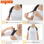 ①調整ベルトを緩めに調整する。②手を上にあげ片方ずつ腕に通します。③両手を上にあげて滑らすようにすると楽です。④ねじれを直す。⑤ベルトで強さを調整する。